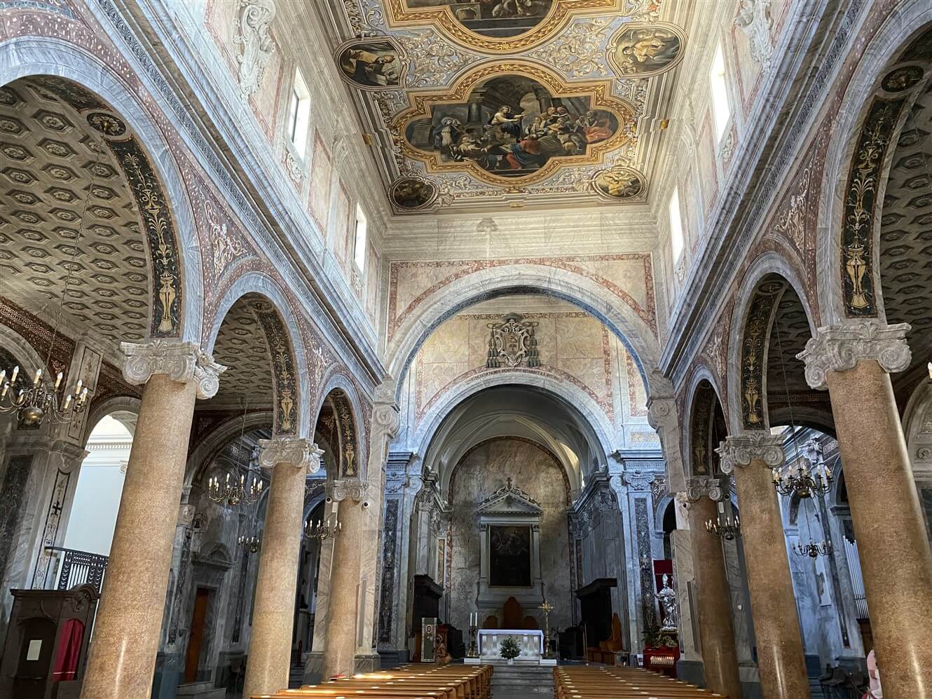 Impossibile non rimanere impressionati dinanzi al grande rosone centrale, considerato il più bello di tutta la Puglia. Di chiaro stampo gotico, è composto da un fregio con dodici profeti a cornice di una raggiera di ventiquattro arcate rette da colonne in pietra. Al centro appare Cristo Salvator Mundi che regge il globo terracqueo. L’interno della Cattedrale è a croce latina con tre navate separate da colonne in marmo ed archi affrescati. Tra i numerosi tesori custoditi al suo interno, vi segnalo i busti di Santo Oronzo e San Biagio, diverse tele settecentesche raffiguranti scene della vita di Gesù e i resti del dipinto del Ritrovamento della Vera Croce, risalente al XVI secolo e raffigurante il ritrovamento da parte dell’imperatrice Elena, madre di Costantino, della Vera Croce tra le numerose accumulate sul Monte Calvario.