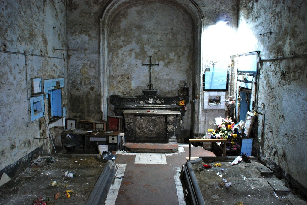 Visitors immediately sense the mystical, spiritual atmosphere that fills the space. The central altar, built of piperno stone in the 1600s, is surrounded by funerary symbols, bones, and skulls — the so-called capuzzelle.