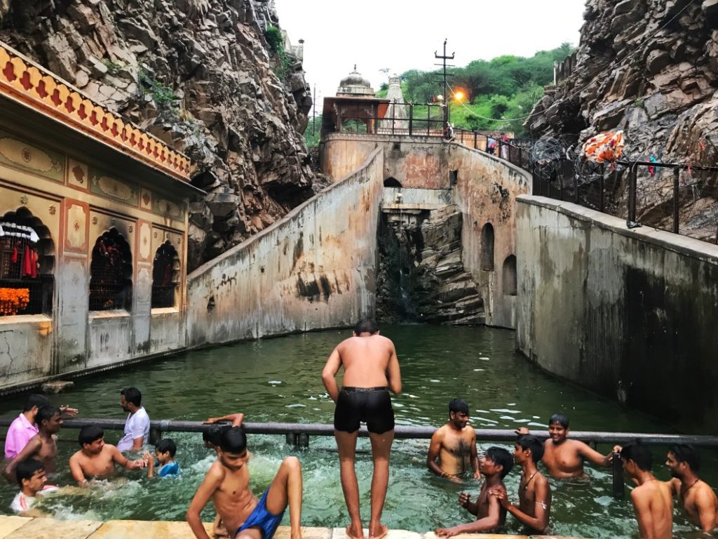 Il Tempio di Galta, risalente al 18° secolo e dedicato al dio Sole e ad Hanumat (spirito dall’aspetto di scimmia), appare incastonato tra due speroni di roccia e, attraverso la bocca di una statua a forma di vacca, animale sacro per eccellenza in India, sgorga l’acqua naturale che riempie le tre piscine che lo compongono. Proprio per questo motivo, l’acqua del tempio di Galta viene considerata sacra al pari di quella del fiume Gange.
