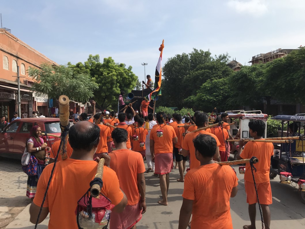 È domenica a Jaipur e la mattinata inizia nel caos delle sue strade, tra gruppi di religiosi che cantano e ballano come in un film. A piedi nudi e a ritmo di danza, trasportano delle piccole ampolle contenenti l’acqua che sgorga dalla sorgente del Tempio di Galta, considerata sacra al pari dell’acqua del fiume Gange.