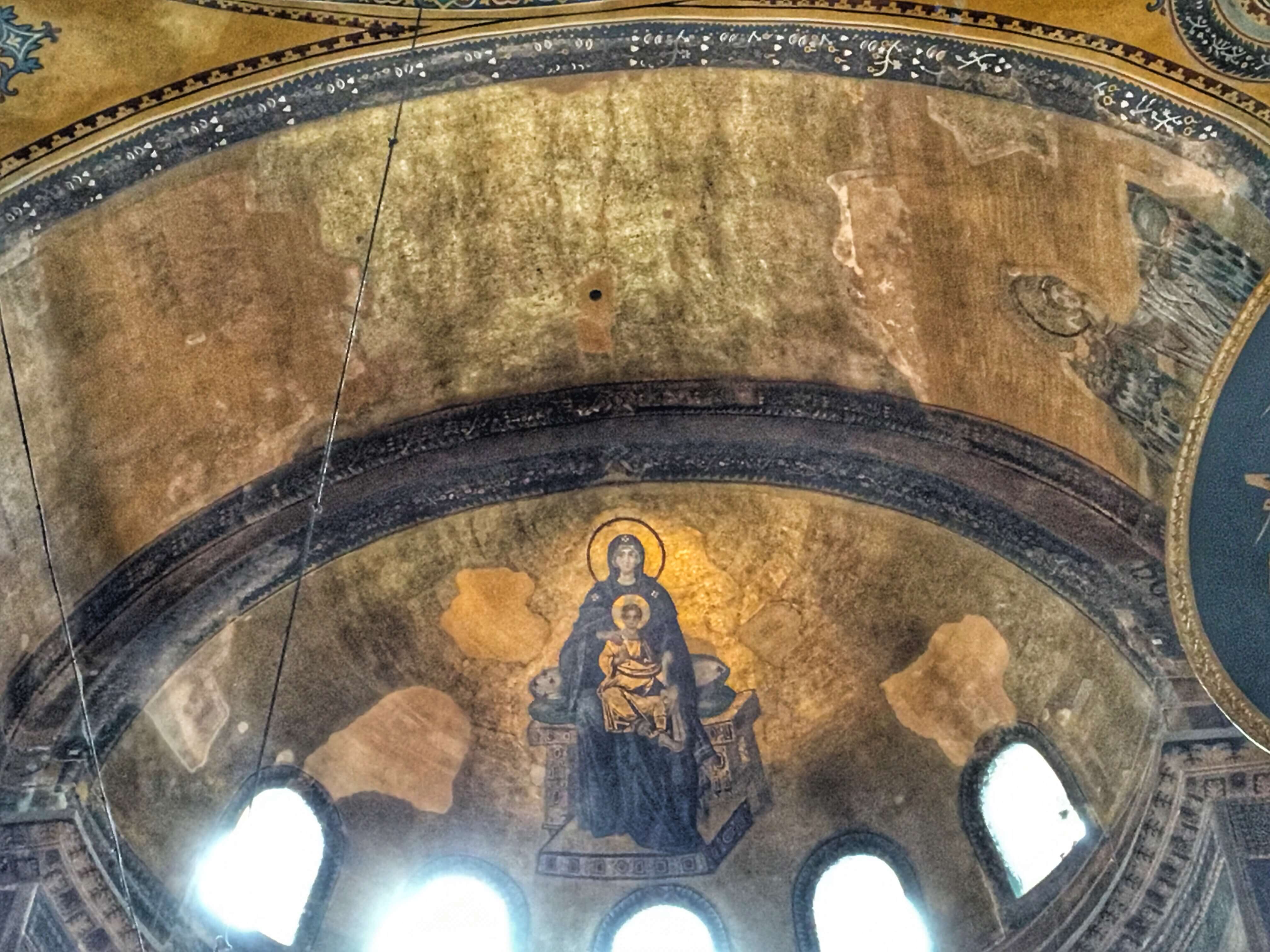 Numerosi, poi, i mosaici presenti, risalenti al periodo bizantino e a quello cristiano. Tra i più conosciuti c’è quello dell’abside che raffigura la Vergine con il bambino. Altrettanto famoso è anche il Cristo in trono davanti al quale si prostra un imperatore, che si trova nel nartece. Inoltre, come retaggio dell’epoca in cui Santa Sofia venne usata come moschea, si possono ammirare otto medaglioni sui quali sono scritti in turco i nomi sacri musulmani.