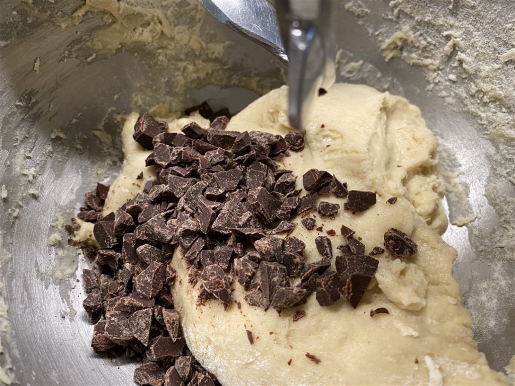 Aggiungete un cucchiaio di miele e la vanillina o l’estratto di vaniglia. Poi, l’uovo e il burro morbido a pezzetti che avrete precedentemente cacciato dal frigo. Unite il pezzo successivo solo quando l’impasto avrà completamente assorbito il pezzo precedente. Verso la fine aggiungete un cucchiaino abbondante di sale e continuate ad impastare. Adesso è il momento di aggiungere le gocce di cioccolato.