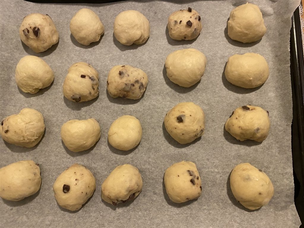 Io ho deciso di dividere l’impasto in due parti, una con e una senza gocce di cioccolato. Ho posto i panetti in due ciotole separate e li ho lasciati crescere per circa 3 ore coperti da una pellicola trasparente.