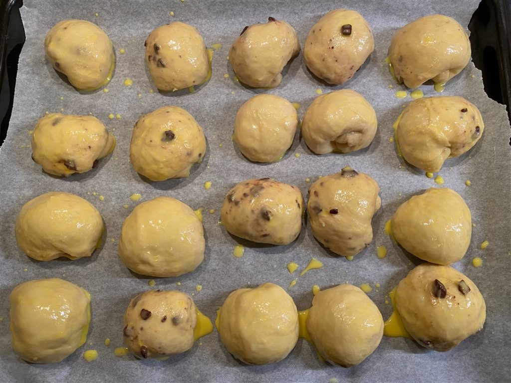 Intanto sbattete il tuorlo con un pò di latte. Una volta che i panini avranno raddoppiato il loro volume, spennellateli abbondantemente. Sui panini senza gocce di cioccolato, potete spargere un pò di zucchero di canna.