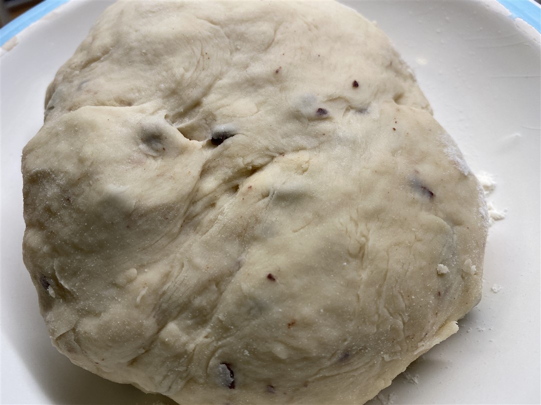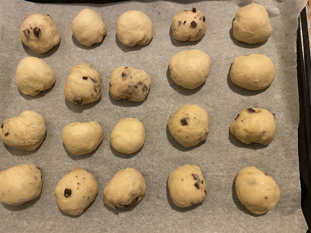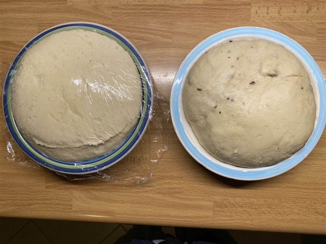 Io ho deciso di dividere l’impasto in due parti, una con e una senza gocce di cioccolato. Ho posto i panetti in due ciotole separate e li ho lasciati crescere per circa 3 ore coperti da una pellicola trasparente.