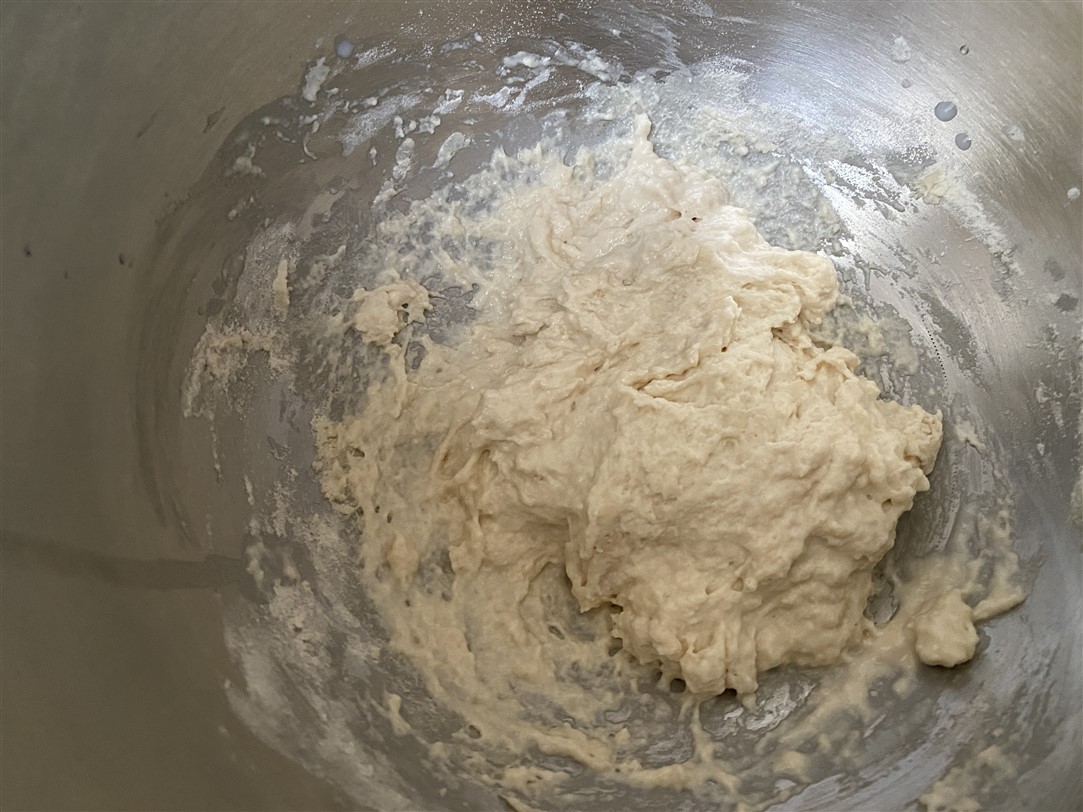 A questo punto, all’impasto ottenuto aggiungete la farina, lo zucchero, l’acqua e il latte. Se utilizzate una planetaria, impastate con la frusta K, altrimenti potete impastare a mano.