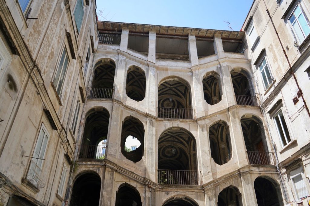 La passeggiata continua a Palazzo Sanfelice, simbolo del passato nobiliare della Sanità, nota un tempo per la salubrità dell’aria e le guarigioni quasi miracolose che avvenivano in zona. Fu per questo che nel 1724 il nobile architetto napoletano Ferdinando Sanfelice decise di trasferirvisi con tutta la famiglia comprando un antico palazzo fatiscente e trasformandolo in una struttura degna di una vera e propria reggia. Il palazzo ha spesso fatto da sfondo a film famosi tra cui il riadattamento cinematografico di “Questi Fantasmi”, di Eduardo de Filippo con Vittorio Gassman e Sofia Loren.