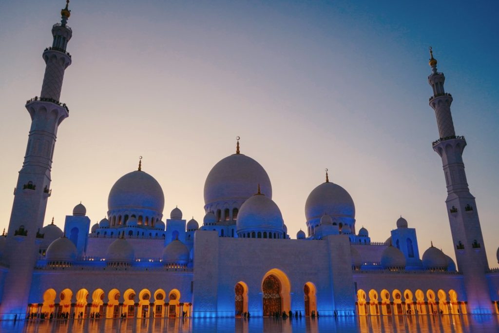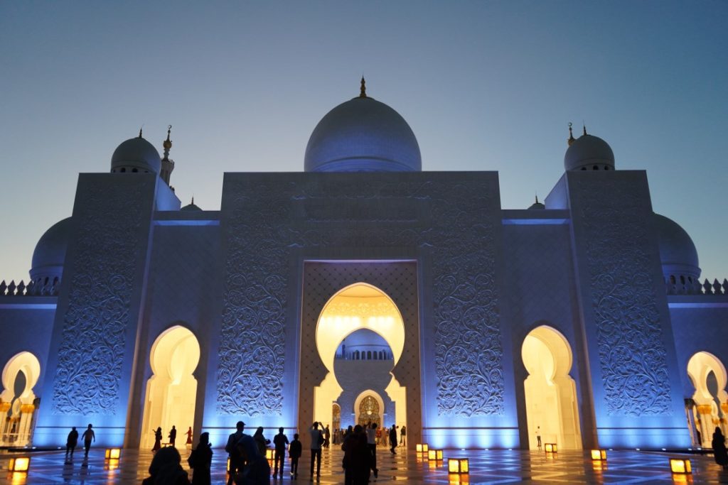 In grado di ospitare fino a 40.000 fedeli, conta 80 cupole dal colore bianco intenso, circa 1.000 colonne, lampadari placcati d’oro a 24 carati, 4 minareti che si stagliano per 107 metri, il tappeto annodato a mano più grande del mondo ed un cortile la cui area è considerata la più grande al mondo in marmo bianco.