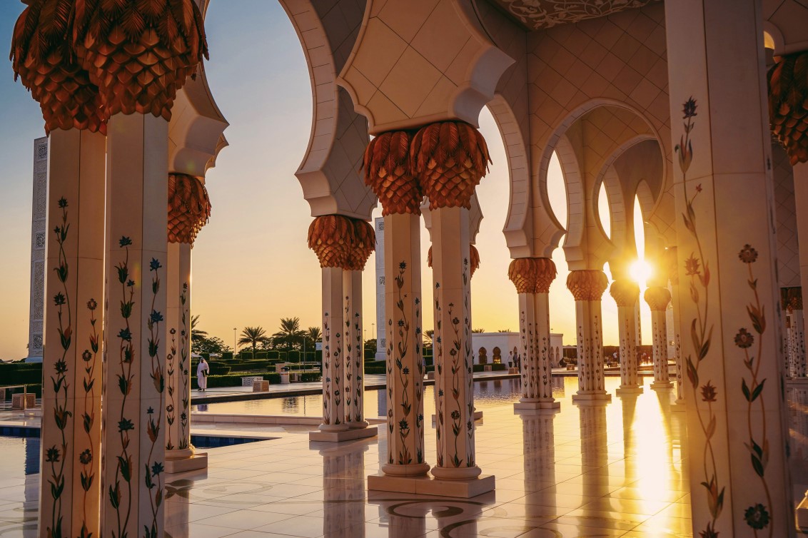 Come se non bastasse, la Moschea è circondata da fontane e vasche d’acqua riflettenti che ne amplificano la bellezza e il fascino. Al tramonto, poi, lo spettacolo è incredibile con i raggi del sole che si riflettono sugli intarsi in oro delle colonne affacciate sulle vasche.