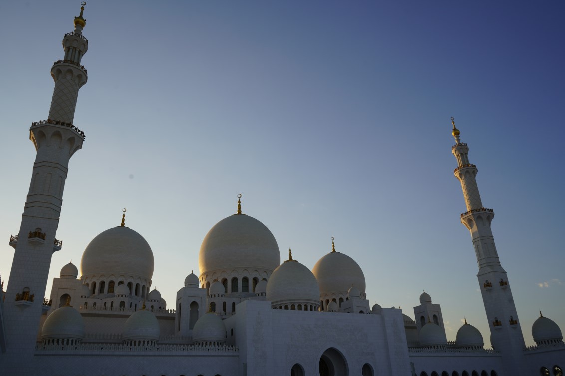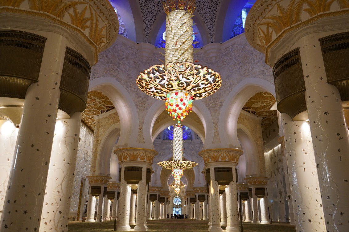 In grado di ospitare fino a 40.000 fedeli, conta 80 cupole dal colore bianco intenso, circa 1.000 colonne, lampadari placcati d’oro a 24 carati, 4 minareti che si stagliano per 107 metri, il tappeto annodato a mano più grande del mondo ed un cortile la cui area è considerata la più grande al mondo in marmo bianco.